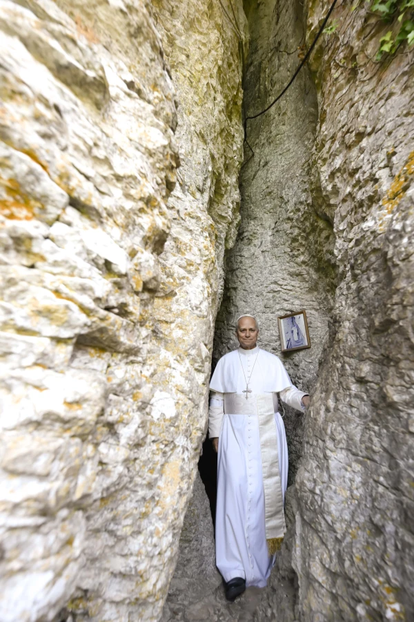Pope Leo exits the cave at Mentorella. Credit: Francesco Sforza/Vatican Media